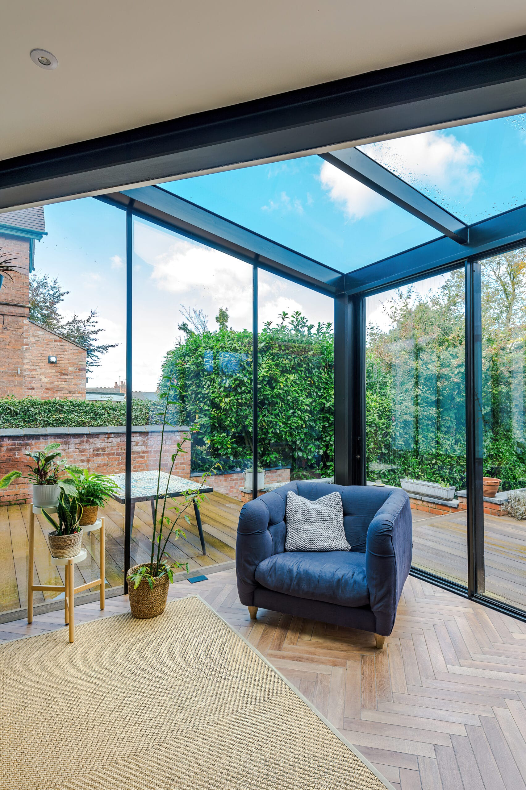 At the rear, two striking triangular glass projections take centre stage. Formed with glass panels over a steel framework, these dramatic structures bring a sculptural quality to the architecture, softened by triangular roof glazing that bathes the interior in natural light.